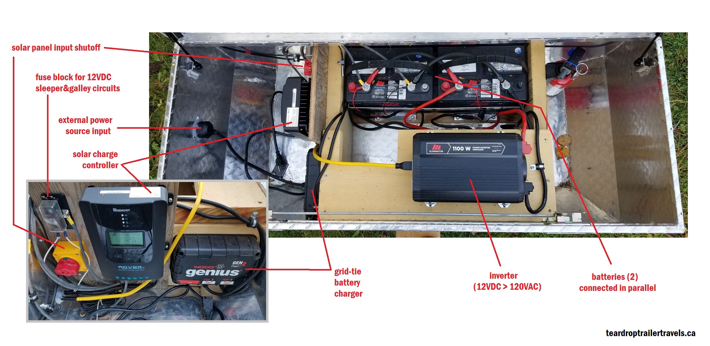 My house is completely off-grid (95% solar power + 5% generator supplement in the dark months) and my Teardrop has more-or-less a scaled-down version of my home system, except instead of a generator as the alternate power source the trailer accepts an external electrical hookup.