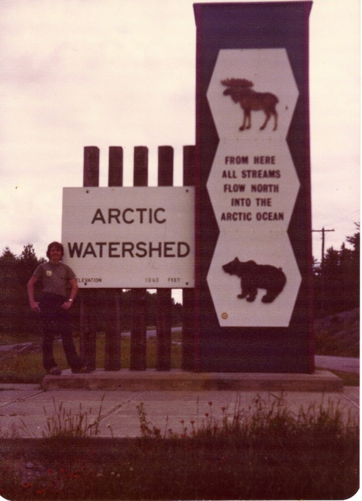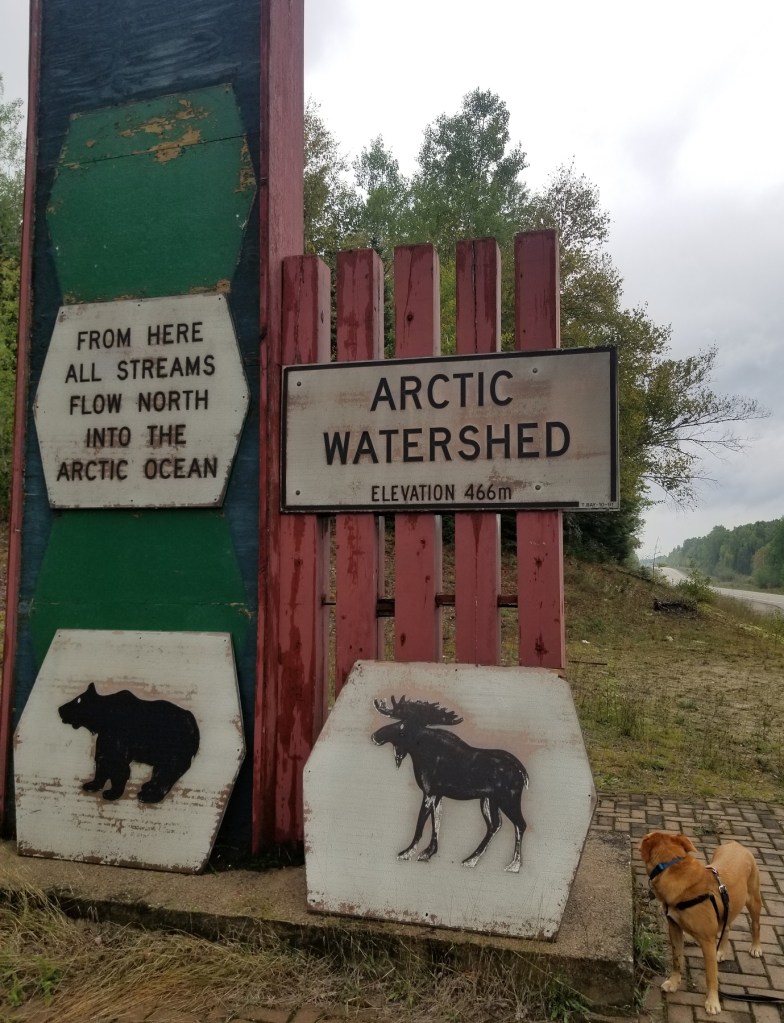 The sign delineating the watershed shows the point where, to the north all rivers flow to James/Hudson Bay and onward to the Arctic Ocean, and to the south flow to the Great Lakes and onward to the Atlantic. Similar signs exist on other major roadways connecting central and northeastern Ontario.
