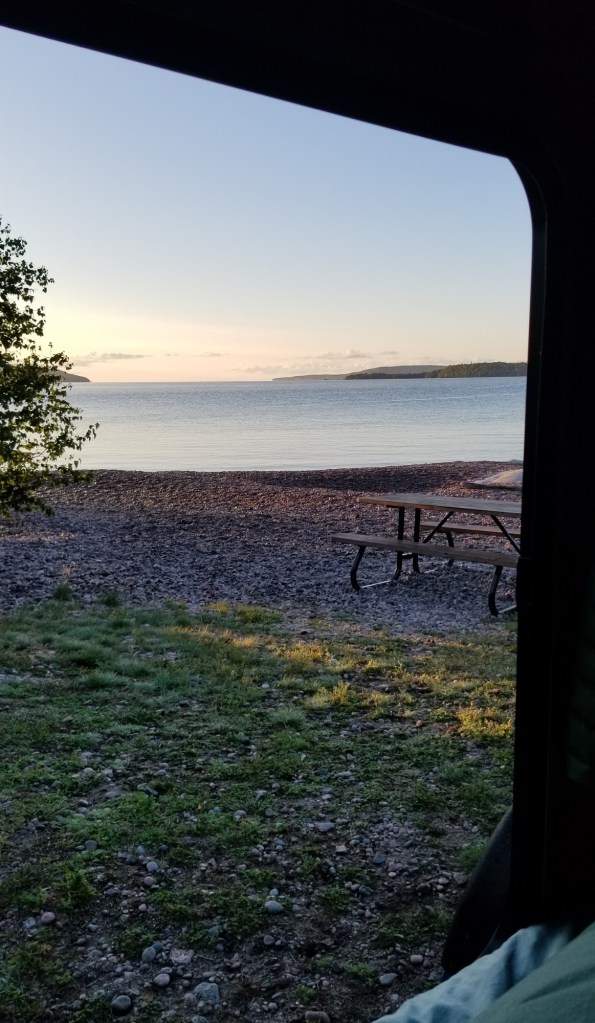 Imagine parking your little Teardrop trailer pretty much right on the shore of Lake Superior, your own rocky point to walk out to, large smooth shore rock right out of a Group-of-Seven painting to set-up for sitting chair, and having an unobstructed water view from the trailer window for morning coffee!