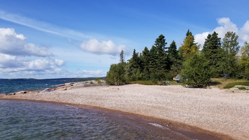 I took a chance booking into Rossport. I had been staying at Neys Provincial Park (a large and stunning park, worthy of its own blog entry… watch this space!) for several nights and was looking for somewhere along the route to Sleeping Giant on my Sept/2023 Superior coastal tour. From the campground map and site descriptions on the Ontario Parks reservations site it was not super-clear what I would be getting, but did I ever luck out and I am ever glad I booked for more than one night!