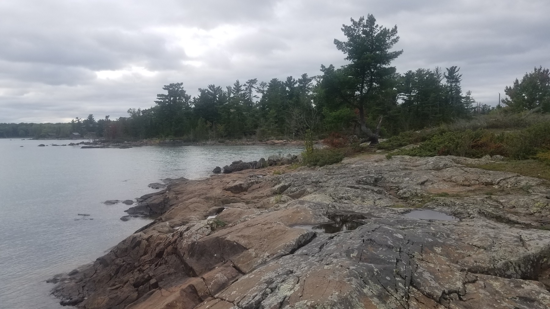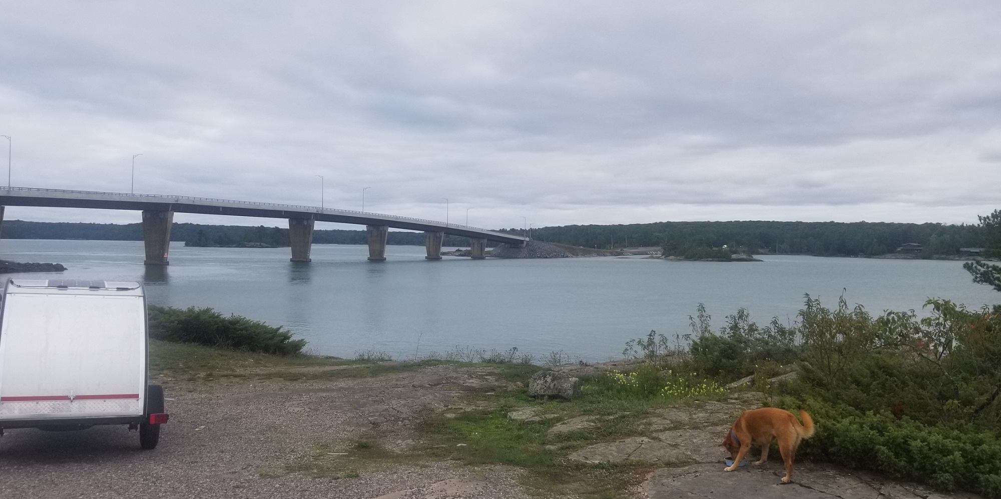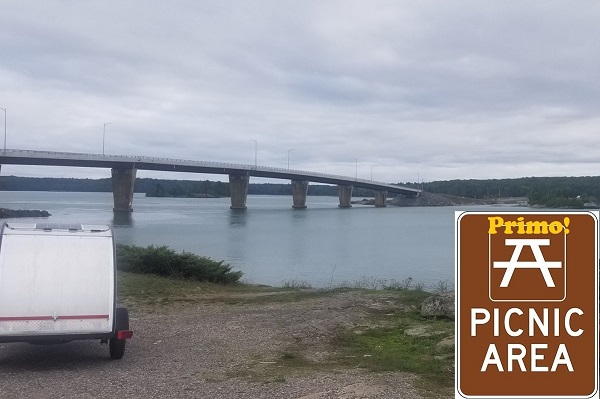 You will be treated to awesome views out into the Wilson Channel of the St Marys River and classic “Canadian Shield” landscape featuring scraggly conifers and pink granite rock meeting the water. The Bamford Island picnic area has a small loop, easily navigable for Teardrop trailers, with multiple spots to pull in, open the galley hatch and take a break. Toilets are available during tourist travel season (no running water). No overnight parking.