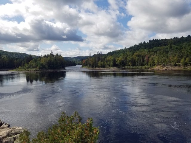 I noticed a well-travelled path, followed it out of curiosity, and a few minutes later emerged from the forest onto a large rock outcrop along the Mississagi River. The views to the south were panoramic, with grand scenery that displayed elements of both Algoma and Canadian Shield landscape. To the north of my viewpoint was the chute itself, a dramatic narrowing of the river which manifested itself in fast-running cascades when I was there in fall, but in spring must be a teeming and wickedly formidable run of rapids.